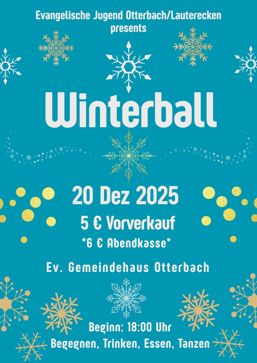 Ev. Gemeindehaus OtterbachWir freuen uns sehr, dich am 20.12.2025 ab 18:00 Uhr zu unserem ersten Winterball einladen zu dürfen. An diesem Abend wollen wir Begegnungen schaffen, das Tanzbein schwingen und einfach einen tollen Abend miteiander verbringen. Damit dies möglichst glamourös wird, bitten wir dich in etwas schickerem Outfit zu erscheinen - es muss nicht die teure Abendgarderobe sein. Nach deiner Anmeldung wird dir dein Ticket für den Abend nachhause geschickt. Selbstverständlich kannst du Eintrittskarten auch an der Abendkasse für 6,00 € erwerben. Wie immer ist auch für das leibliche Wohl gesorgt.